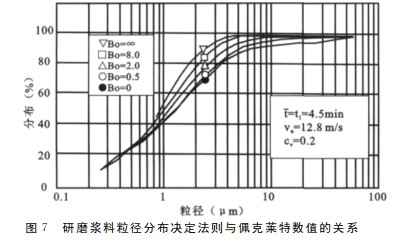 实际应用时,若操作者在研磨过程中,应在研磨室压力允许范围内,尽量增加流量,这样可以提高佩克莱特数值,以便得到分布较窄的粒径。如图7所示,佩克莱特数值越大时,所得到颗粒粒径分布将越窄。