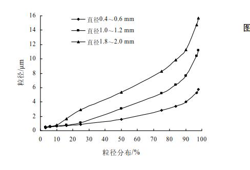 采用不同粒径的砂磨介质,所获得的砂磨效果不同。试验2.1中分别选用了直径为0.4~0.6,1.0~1.2,1.8~2.0mm3种锆珠作为砂磨介质,得到了如图2和图3的粒径分布曲线。